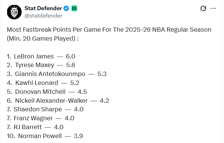 北京时间1月17日,据Stat Defender的数据显示,在全联盟本赛季至少出战20场比赛的所有球员中,詹姆斯的场均快攻得分(6.0分)排在第一位,马克西和字母哥分列二三。具体排名如下,括号内为场均快攻得分——